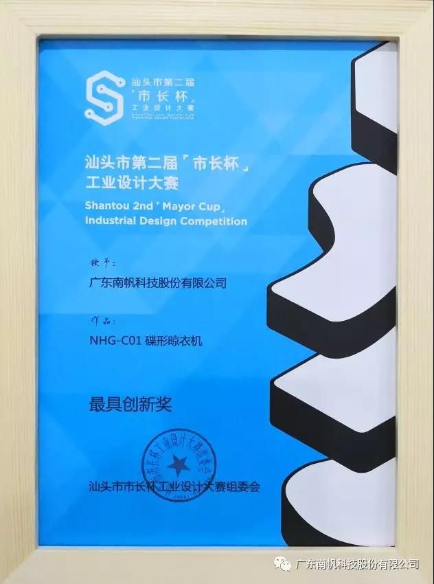 其中,廣東南帆科技股份有限公司自主研發的碟形晾衣機,獲得本屆“市長杯”工業設計大賽“最具創新獎”!
